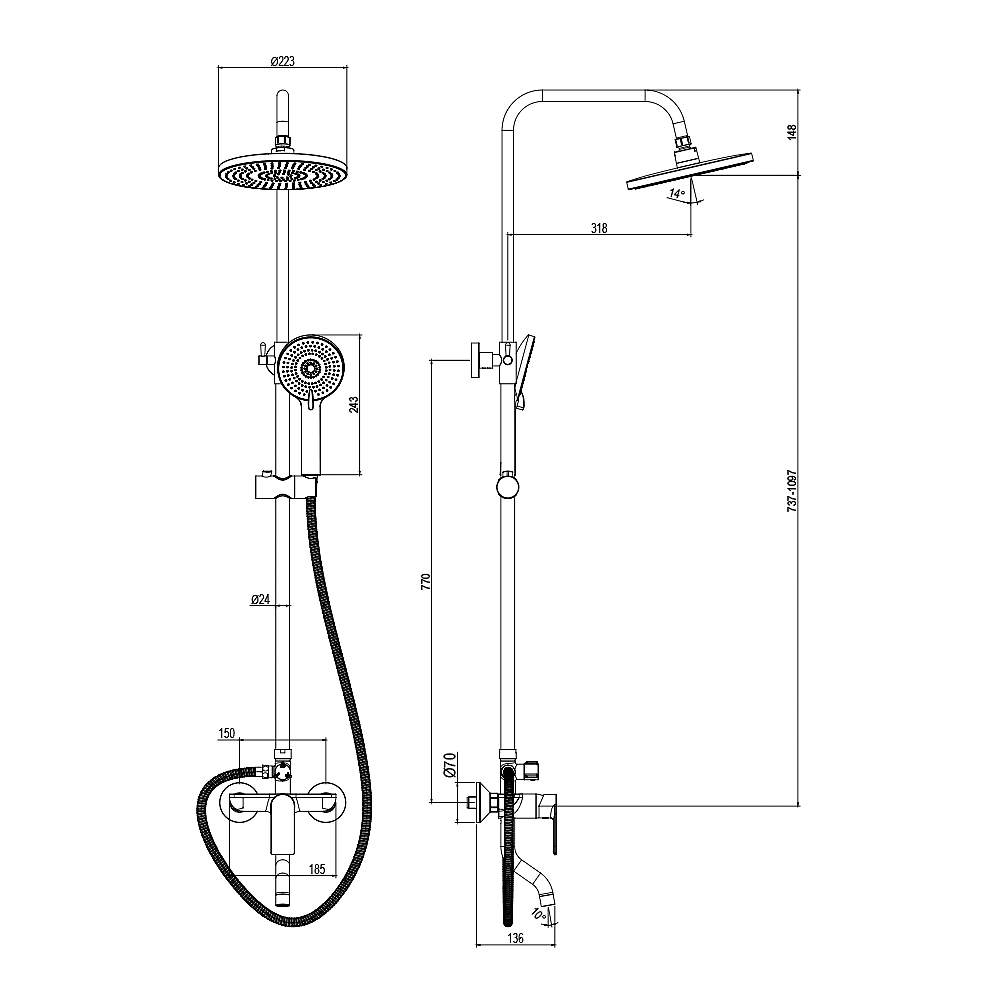 Штанга для душа, мм 1000-1199